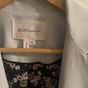BCBGeneration blazer in a pale blue color. Exaggerated shoulder detail. Transitional piece - can be worn to the office or gun night out. Only worn twice. No fabric defects. XS
