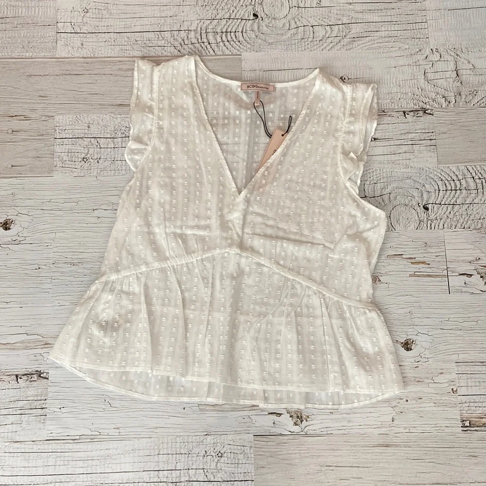 NWT cute BCBGeneration blouse. V-neck, cap sleeves, empire waist. Measures 17 1/2 inches pit to pit.