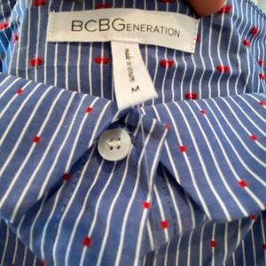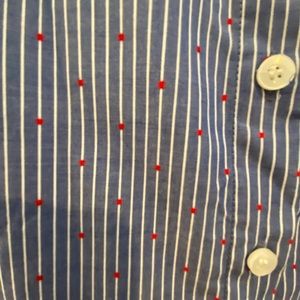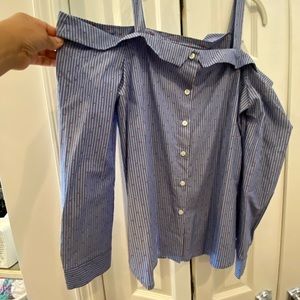 Stylish blue striped button down shirt. Features off-shoulder design. Perfect for casual wear.