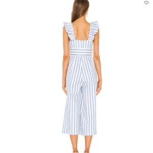 Stylish jumpsuit with blue and white stripes. Features ruffled sleeves and a front tie detail. Perfect for casual outings. Perfect for summer! No signs of wear. cropped leg