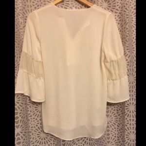 Cream colored Boho style blouse from BCBGeneration. V neck. Ruffled bell sleeve with sheer cut out. Loose fitting. Size XS. No flaws!
