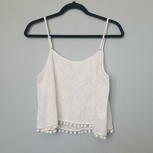Whisper white is the description on the tag, but appears like a ivory cream to me. Super cute, adjustable straps and textured fabric. Adorable soft pom poms go all the way around. Front and back look exactly the same. Semi sheer. Smoke free home. Jacquard boho pattern. Flirty, girly, clean girl cutesy, airy, beach, vacation, sweet, twee, romantic, resort, travel, tomato girl