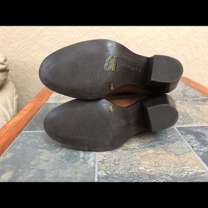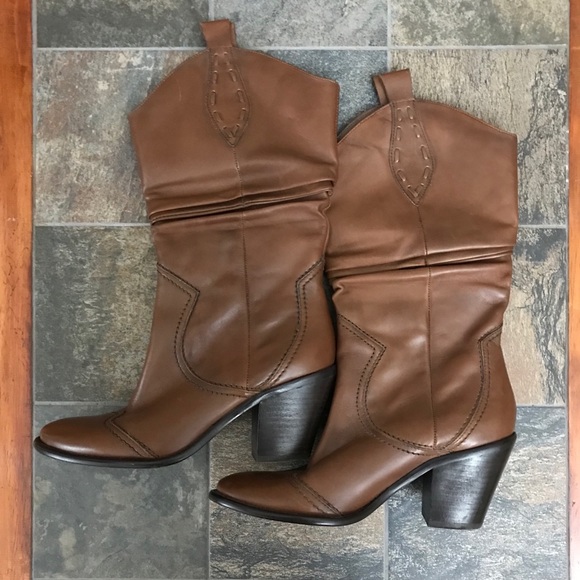 Brown slouched look boots with a heel that is about 3 inches. They are in good condition with minimal wear to soles. There are some very small scratches on the boots, please see photos.