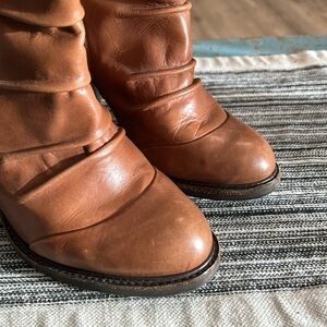 BCBGeneration Women's Brown Leather Boot Stack Wood Heal Style: Clown Made in: China Features: -Zipper Detail -Ruched Leather -Stacked Wood Heel -Leather Upper Man Made Lining Sole