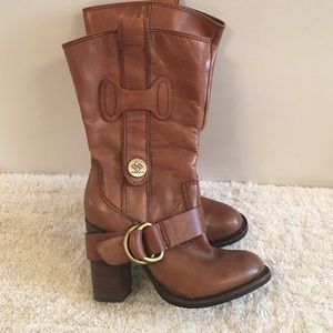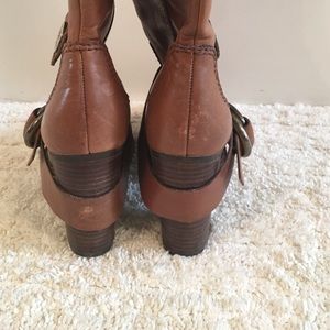 BCBGEneration Brown leatherboots with buckle around the heel. The heel is chunky and makes these boots so comfortable!