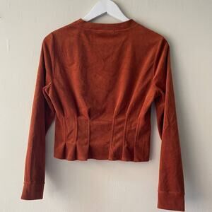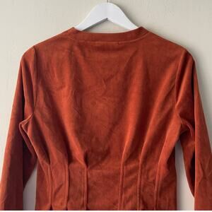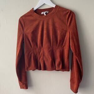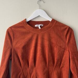 BCBGeneration Burnt Orange Brown Soft Faux Suede Crew Neck Corset Style Pleated Waist Long Sleeve Top