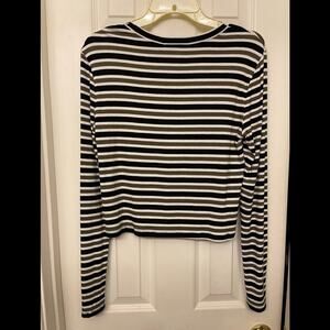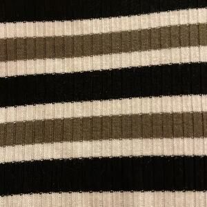 Ribbed top with black, olive, and white stripes. Crew neck, waist length fit, long sleeves. 95% rayon, 5% spandex. Size large from pit to pit 19.5 inches, length 18.5 inches.