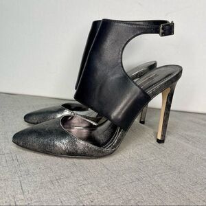BCBGeneration Chaser Pewter Stiletto Heel Closed Toe Open Front Pump featuring a wide solice vamp and buckled back strap. Crackled texture heel and toe. Lightly padded collar. Black and silver. Leather upper. 4” heel. New with tags.