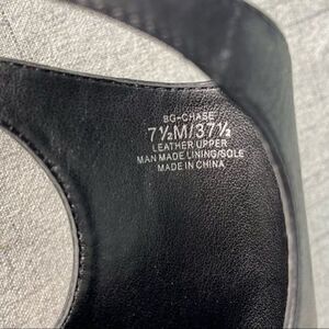 BCBGeneration Chaser Pewter Stiletto Heel Closed Toe Open Front Pump featuring a wide solice vamp and buckled back strap. Crackled texture heel and toe. Lightly padded collar. Black and silver. Leather upper. 4” heel. New with tags.
