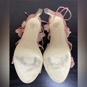 BCBGeneration Chikox Petal Heels. Size 8.5. Color: Pink. Feminine, classy, statement heeled sandal. A must have for your wardrobe. Add a soft pop of color to any outfit, weekend wear, formal, street wear. All pictures are of the shoe you will receive. See last two pictures for minor wear.