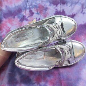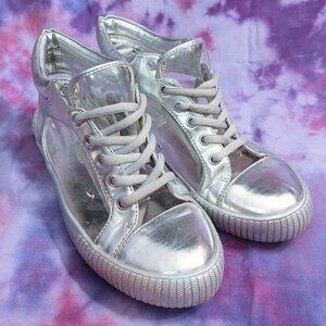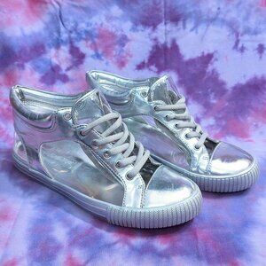 Great condition BCBGeneration Women's size 7 sneakers. Metallic silver & clear with light grey laces. The only part of these that shows much wear are the back heals underneath the BCBG logo; The silver coating has worn off and you can see the white rubber of the soles (See pictures 8 & 9). There are two vent holes on the inside arch of each shoe, so they don't fog up like many other "clear" shoes. There's slight padding around the ankles underneath the silver so they aren't uncomfortable to wear.