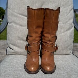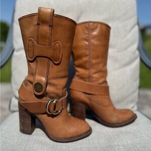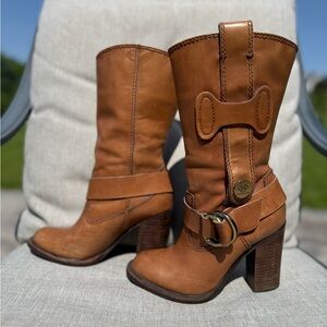 BCBGeneration Cognac Brown Heeled Boots w/ Chunky Heel and Harness Strap -Size 6