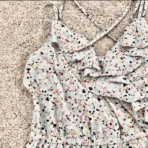 light and airy chiffon like dress with a blue/gray background speckled with yellow, pink, black and white confetti print will look so cute with knee-high boots and lightweight cardigan for fall. Adjustable double criss cross spaghetti straps with a front V ruffle trim neckline and snap closure for coverage