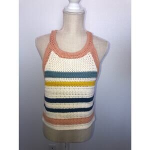 This top takes inspiration from the seventies. It is a striped crochet knit sweater tank that pairs perfect with high-waisted pants or shorts. It features a high neck line and a cropped silhouette, the cropping is meant to hit mid belly button. New with tags, no rips, stains, or damage.