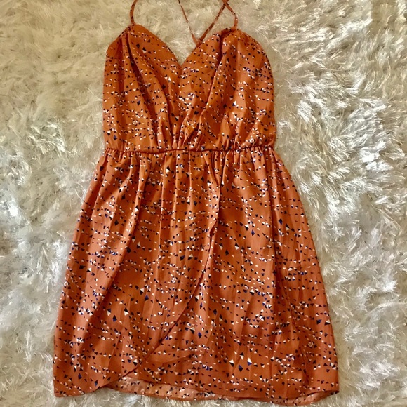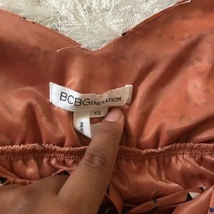BCBGeneration Dress - Elastic band above waist line. Adjustable Cross back spaghetti strap. Size: XS Color: Salmon with black, white, and blue triangle patterns. Label have stains, see pictures. Approximate measurements: Top to Bottom: 28’’