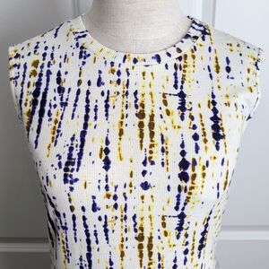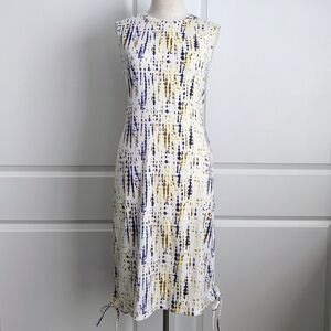 High crew neckline. Sleeveless. Vertical rib knit fabric with stretch. Ruched drawstring detail at side seam bottom hem. Bodycon, fitted silhouette. Above the knee length. Allover vertical tie dye print on white background. Slips on over head.