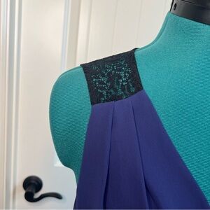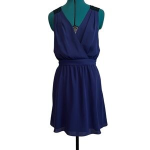 Chic royal blue mini dress by BCBGeneration. Black lace detail on the back. Flared fit. Plunge neckline. side zipper and clasp closure. Perfect for any occasion, casual, cocktail, dress, party, formal.