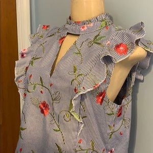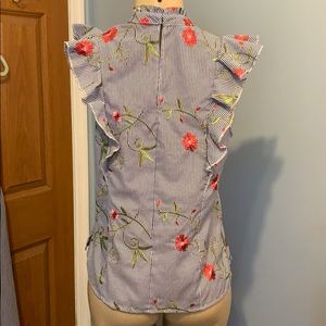 Ruffle Top with embroidered flowers, white and blue stripes