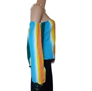 A striped tie-dye print on soft, stretchy cotton gives this off the shoulder top a cool retro vibe. Long volume sleeves and a beaded lace-up front add to its vintage aesthetic.