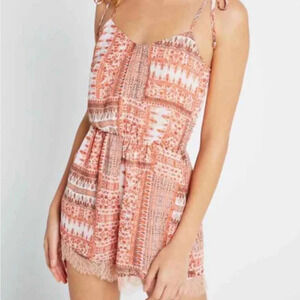boho print peach pink lace Romper with side pockets V neck one peice romper size XS in great condition.