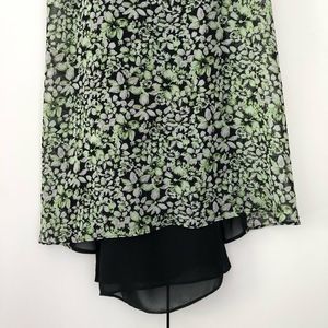 Spaghetti strap style top with drape like fit and green and black floral pattern