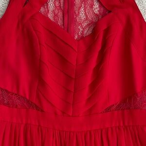 BCBGeneration Formal Goddess Maxi Dress - Rouge (Red) - Size 6 - Formal/Prom/Wedding. This dress is absolutely stunning! Features a round neckline with open cut-out detail, pleated detail on the bodice in the front, lace detail at the waist and on the back, beautiful chiffon-like fabric, long side slits (please see measurements), hidden back zip with hook/eye closure, and lined. This dress is perfect for the holidays, a wedding, prom, or any other formal event. Excellent pre-owned condition!