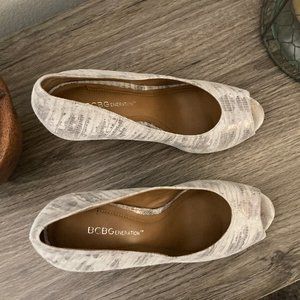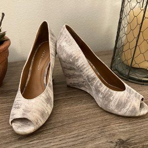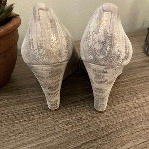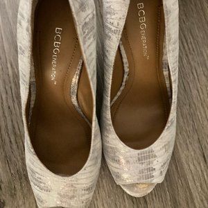BCBGeneration Gold Silver Metallic Leather Claudia Wedge Peep Toe Shoe 7.5M