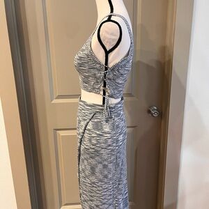 This BCBGeneration skirt features a chic wrap design in a heathered gray and white pattern, perfect for casual outings. The midi length and side slit add a touch of elegance, while the stretchy knit fabric ensures comfort and ease of movement. Top size XS, skirt size S. Never worn. No tags. No stains, no defects. Excellent condition.