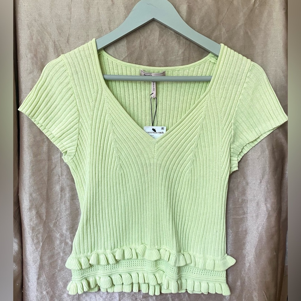 This lime green top by BCBGeneration features a ribbed texture and playful ruffled tiers at the hem. The cap sleeves and V-neckline add a touch of elegance to this stylish top, making it a versatile addition to any wardrobe. 💚