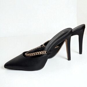 BCBGeneration Havinda mules with stunning metallic chain detailing! These sleek black chain mules are perfect for someone with slightly different sized feet.