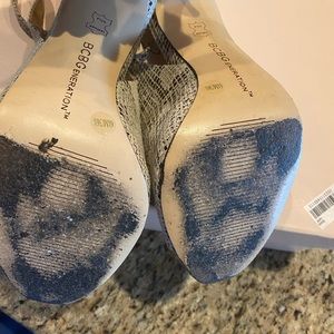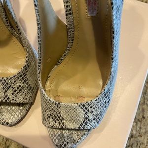 Snake skin gray/black ankle strap heels. Very sexy heels! Always received compliments when I wore these! Some wear on the toe bed area and heels may have some marks, but it’s hard to tell. Over all great shoe with lots of wear left in them! Box included.