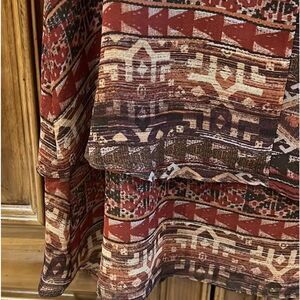 Size M. 100% polyester, keyhole back with hook, double layer print chiffon, lined. Swing style, round neckline. Approximate measurements are pit to pit 19”, length from shoulder approximately 28”. Shades of brown, tan, burgundy, orange, black.