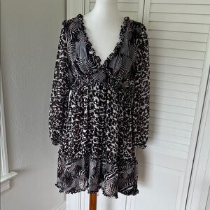 Black open jacket. Faux leather sleeves, textured panels in front. Cropped length (20”), great used condition with no damage or stains.