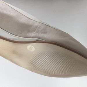 Sleek, pointy-toe flat in two-tone beige leather patent and matte.