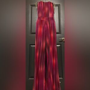 BCBGeneration Jumpsuit has bold colors with thin vertical striped fabric. Jumpsuit is made from flexible fabric for an easy pull on style.