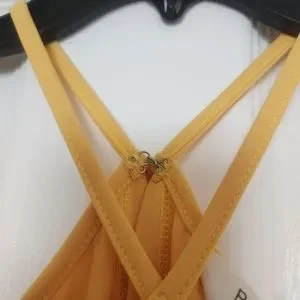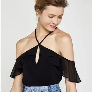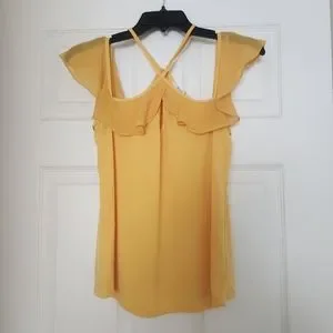 Beautiful yellow gold color! Hig neck halter with keyhole and ruffle cold shoulder detail. Can be worn tucked in or not. Super lightweight, soft and comfortable.