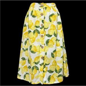 Description: This charming BCBGeneration midi skirt features a whimsical lemon and leaf print on a white background. The skirt has a flattering A-line silhouette and a full button-front closure with natural-toned buttons. It is a perfect piece for a vacation, a summer outing, or a romantic, feminine look.