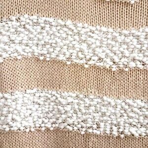 BCBGeneration sweater with thick tan and white stripes, with a microsphere texture on the white stripes. Minor repair located where collar meets left shoulder measuring about 1 inch x 0.5 inch. (Look at the third image to see in detail.) It's very unnoticeable. Price is heavily discounted as a result.