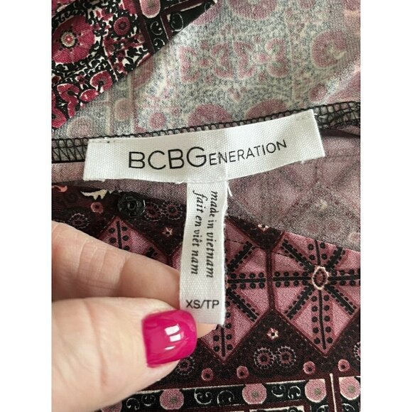 BCBGeneration Women's Mini Boho Dress Size XS BCBGeneration Dress Lovely maroon combo, high neck, faux wrap style mini dress! Perfect for summer! BCBGeneration Dresses Mini