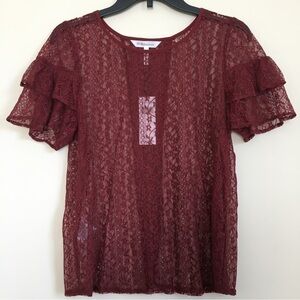 BCBGeneration Maroon Red Sheer Lace Top Tiered Ruffled Sleeve Vented Back Blouse