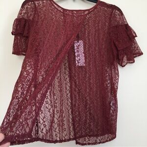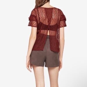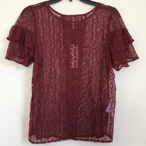 BCBGeneration Maroon Red Sheer Lace Top Tiered Ruffled Sleeve Vented Back Pullover Blouse