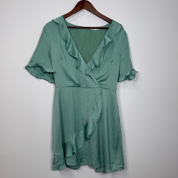 Chic mint wrap dress with playful ruffles. Short sleeves and a flattering fit. Ideal for stylish outings.