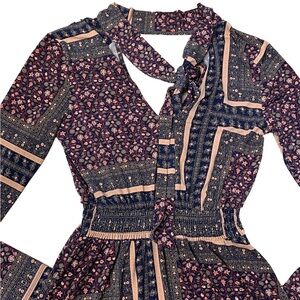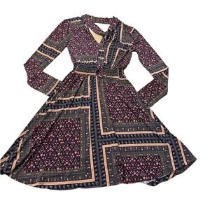 BCBGeneration | Multi Print Long Sleeve Size Small Dress Neck Tie Blue Purple Beige Floral Stripes Synched Waist Flattering