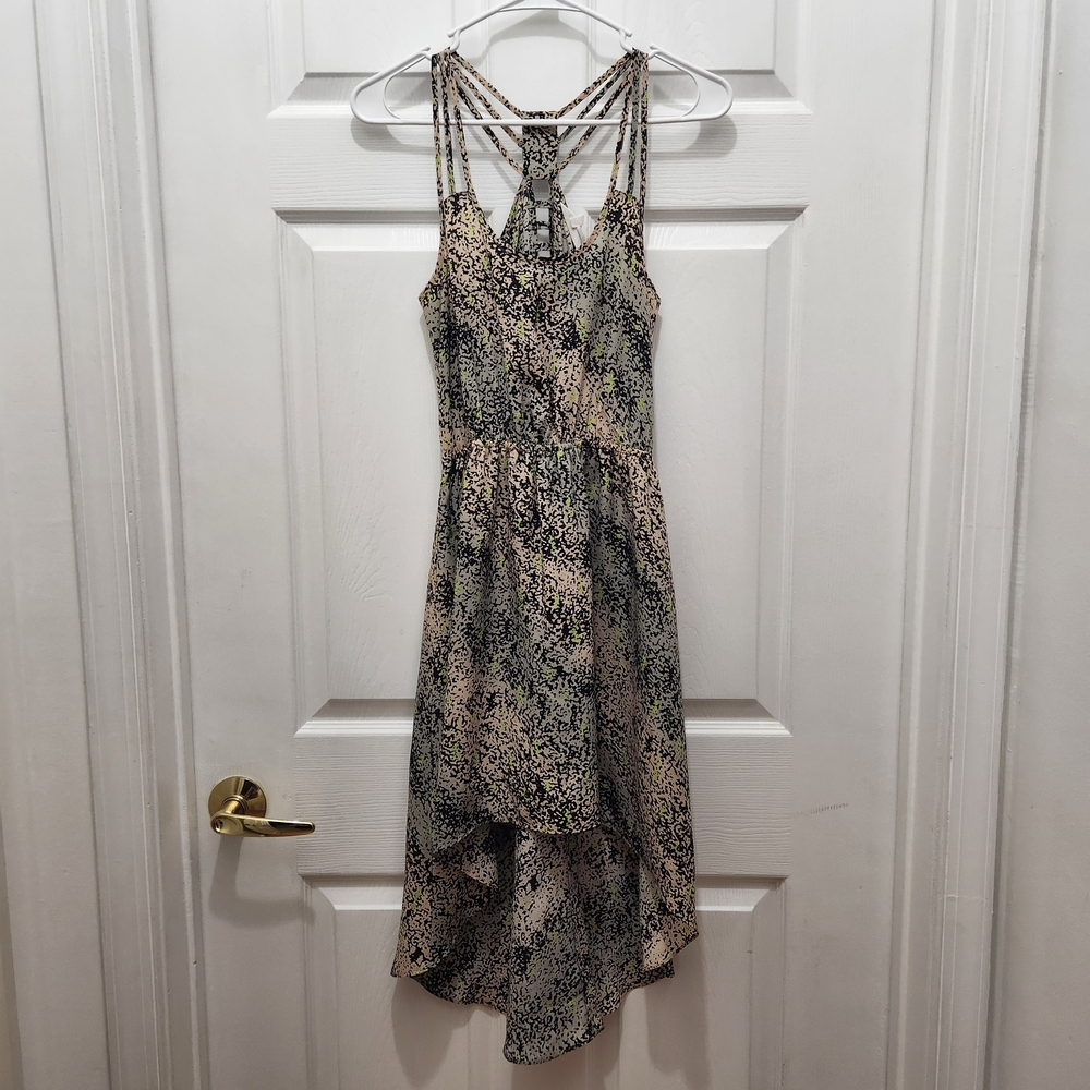 Chic high-low dress with a multicolor pattern. Strappy racerback design. Perfect for stylish outings.