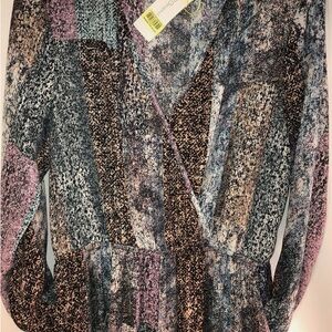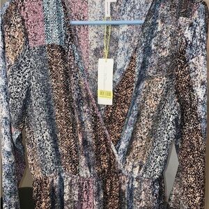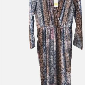 BCBG Generation Stylish multicolor animal print jumpsuit. Features long sleeves and a wrap design. Perfect for any occasion.