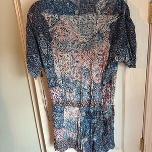 Chic wrap short romper with vibrant paisley pattern. Features a blend of blue, red, and white hues. Ideal for casual wear.