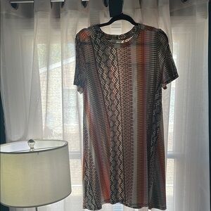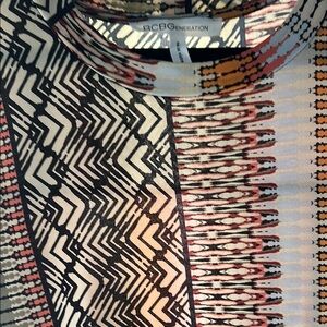 Stylish BCBGeneration dress with a vibrant multicolor pattern. Features shades of orange, black, and cream. Perfect for a chic look.