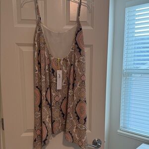 Stylish mini dress with intricate patterns. Features a mix of colors for a vibrant look. Perfect for casual outings. Sharkbite hem