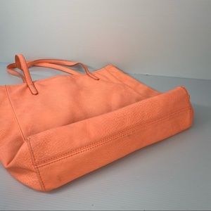 BCBGeneration Neon Pink Tote Bag. RN 80734. Vegan leather exterior. Fabric lining interior. Magnetic closure main pocket. Interior zipper pocket. Interior device pockets. Scalloped edge detail. Some discoloration in pictures, item is neon pink closer to coral. Some creasing and staining. See pictures. Used condition. Sold as is. Not original owner.