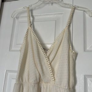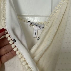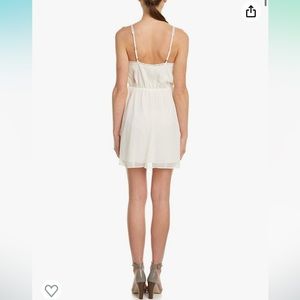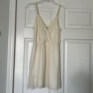 BCBGeneration. EUC. No damages. Off-White. Sleeveless. Spaghetti straps. Wrap front. Snap closure. Adjustable straps. Crochet detail on straps and chest. Polka dots. Embroidered. Elastic waist. Mini dress. Lined. Sun dress. Bridal. Bachelorette. Wedding. White party. Summer. Graduation dress. Bundle multiple items for savings! Smoke free home.